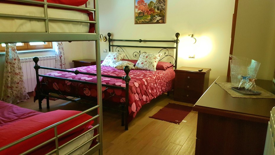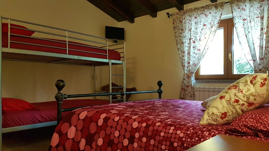 La cámara Papaveri es genial para una familia. Hay una cama matrimonial y unas literas (dos camas). Entonces la habitación puede ospitar máximo cuatro personas.